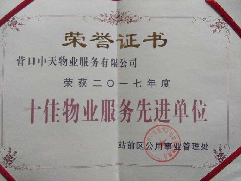 2月6日營口市站前區(qū)公用事業(yè)管理處召開2017年度表獎大會,會上授予中天物業(yè) “2017年度十佳物業(yè)服務(wù)先進單位”稱號。