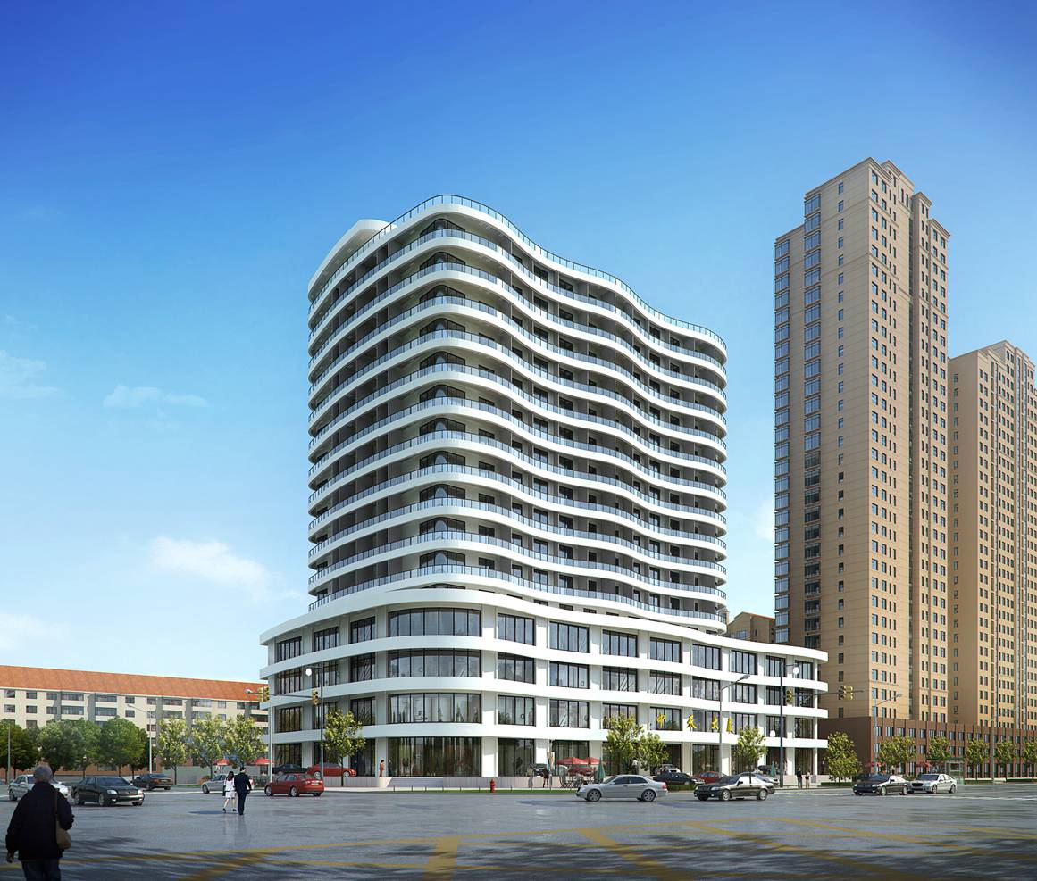 在建筑表現(xiàn)形式上,采用現(xiàn)代建筑風(fēng)格,建筑立面結(jié)合營(yíng)口作為海濱城市特點(diǎn),利用框架剪力墻結(jié)構(gòu)的支撐,每一層都包裹上鋼筋混凝土懸臂弧形陽(yáng)臺(tái),借用曲邊陽(yáng)臺(tái)前后進(jìn)出起伏的變化,營(yíng)造出近似水紋波浪的建筑表現(xiàn)。采用高檔外墻飾面層,通過精雕細(xì)刻的施工工藝,呈現(xiàn)出精致美觀的城市建筑,完善城市的天際線,豐富城市的建筑街景。