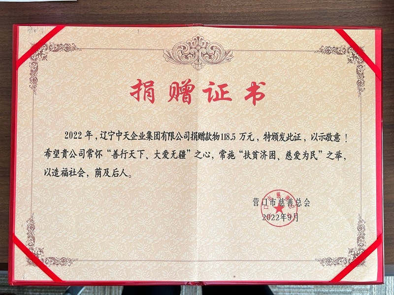 2022年,由于營(yíng)口地區(qū)發(fā)生了新冠疫情,中天集團(tuán)加大了愛(ài)心慈善捐助力量,先后兩次為營(yíng)口慈善總會(huì)捐款90萬(wàn)元,疫情期間捐贈(zèng)抗疫物質(zhì)折合人民幣近10萬(wàn)元,同時(shí),繼續(xù)啟動(dòng)“中天助學(xué)金”和“中天愛(ài)心物資發(fā)放”兩大愛(ài)心項(xiàng)目,為31名貧困家庭考入大學(xué)的學(xué)生捐資15.5萬(wàn)元,為600戶貧困居民送去米面油折合人民幣10萬(wàn)元,持續(xù)做好“獻(xiàn)愛(ài)心做慈善”的活動(dòng)。