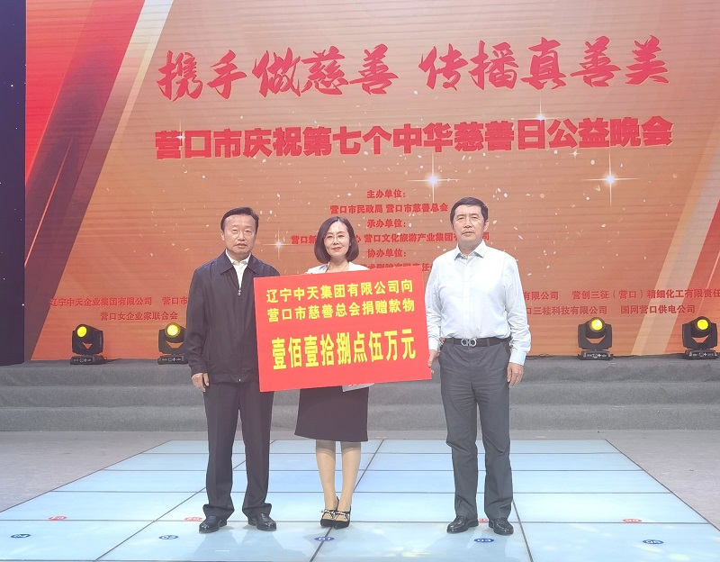 2022年9月27日,營(yíng)口市慈善總會(huì)在營(yíng)口新聞傳媒中心壹號(hào)演播大廳舉辦第七個(gè)“中華慈善日”晚會(huì)。晚會(huì)現(xiàn)場(chǎng),總裁于洪波代表中天集團(tuán)向營(yíng)口慈善總會(huì)捐款捐物118.5萬(wàn)元。