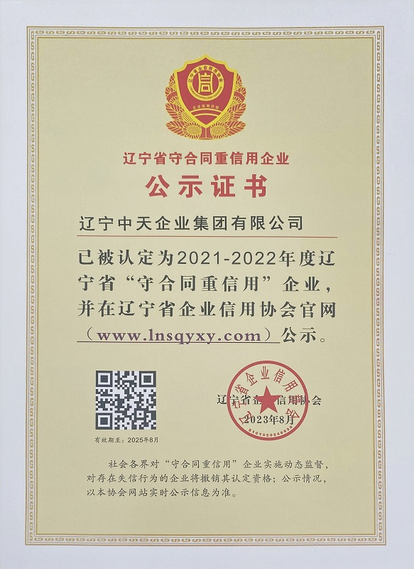 2023年8月,集團(tuán)被遼寧省企業(yè)信用協(xié)會認(rèn)定為2021-2022年度遼寧省“守合同重信用”企業(yè)和信用等級5A級企業(yè),這是中天企業(yè)集團(tuán)自2005年以來,連續(xù)第19年獲此殊榮,既是對我們過去經(jīng)營中取得成績的肯定,也是對我們今后經(jīng)營和發(fā)展中所給予的希望和所提出的要求。中天企業(yè)集團(tuán)成立至今,始終以“誠信為本,服務(wù)至上”為經(jīng)營理念,在企業(yè)發(fā)展中,將誠信貫穿經(jīng)營以及對客戶服務(wù)的全過程,把誠信作為企業(yè)的創(chuàng)業(yè)之本,立業(yè)之基。未來,我們將矢志不渝的堅(jiān)持用誠信打動客戶,以誠信塑造品牌,打造誠信企業(yè)品牌。