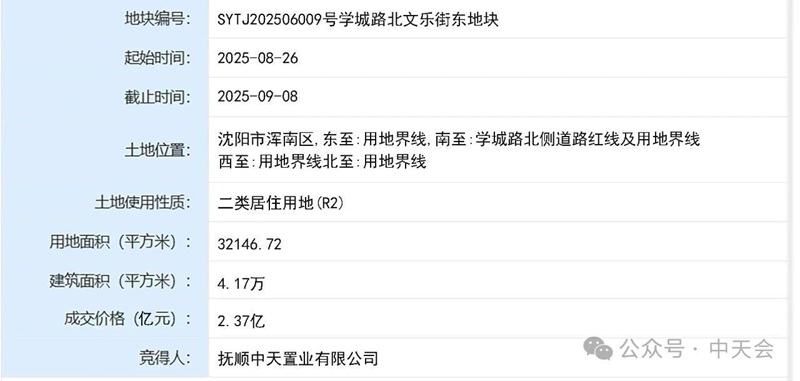 2025年9月8日,遼寧中天企業(yè)集團(tuán)旗下?lián)犴樦刑熘脴I(yè)有限公司以2.37億成功斬獲備受矚目的沈陽市渾南區(qū)核心板塊長青學(xué)城路北、文樂街東地塊,標(biāo)志著中天集團(tuán)成功進(jìn)軍沈陽市,進(jìn)一步實現(xiàn)布局遼寧的戰(zhàn)略構(gòu)想,企業(yè)戰(zhàn)略發(fā)展版圖再擴張。
