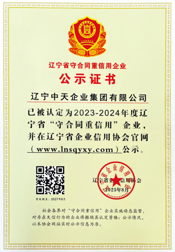 近日,中天集團憑借卓越的商業(yè)信譽和嚴謹?shù)穆募s能力,被遼寧省企業(yè)信用協(xié)會認定為2023-2024年度遼寧省“守合同重信用”企業(yè)和信用等級5A級企業(yè),這是集團自2005年以來連續(xù)20年獲此殊榮。這一榮譽不僅是對集團長期以來堅持誠信經營的高度認可,更是對企業(yè)在打造品牌、服務社會方面不懈追求的充分肯定。