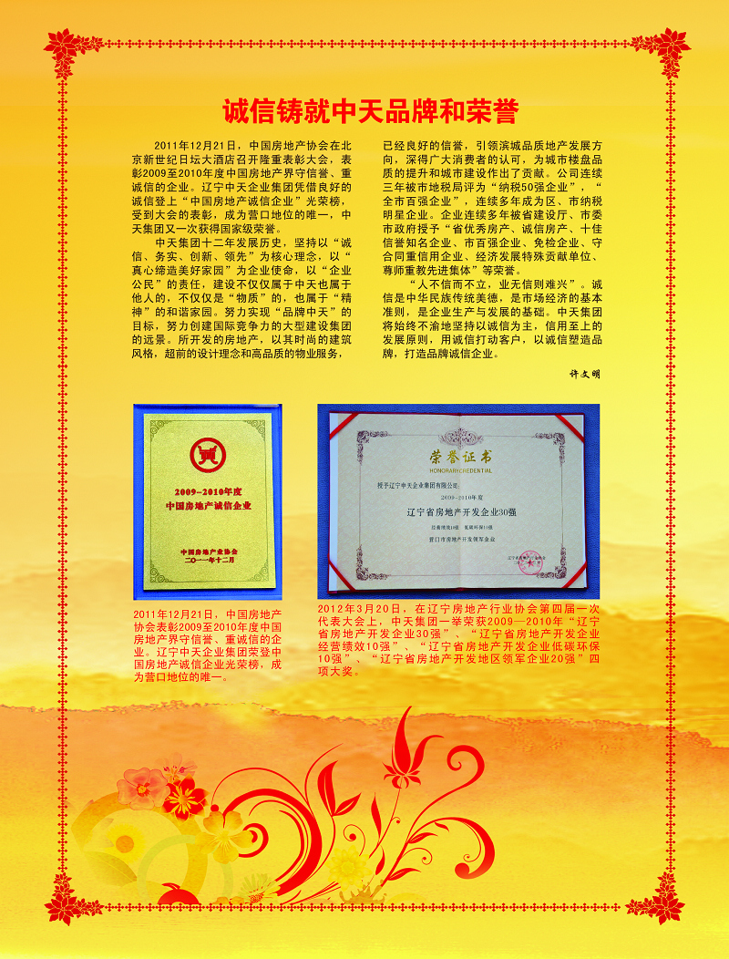 中天集團連續(xù)十三載榮獲“市守合同重信用”企業(yè)榮譽稱號?!罢\實守信”是一個企業(yè)在激烈的市場競爭中保持旺盛生命力和競爭力的根本,是建立市場經(jīng)濟秩序的基石,是企業(yè)可持續(xù)長遠穩(wěn)健發(fā)展的保障。中天集團成立至今,已建立起自身獨特的“誠信機制”,對業(yè)主說到做到,對客戶說到做到,與主管政府部門領導說到做到,嚴格按合同履行各項責任與義務,“共贏互利、信守承諾”得到了社會各界的一致認可與好評,集團也走出了屬于中天特色的發(fā)展之路。